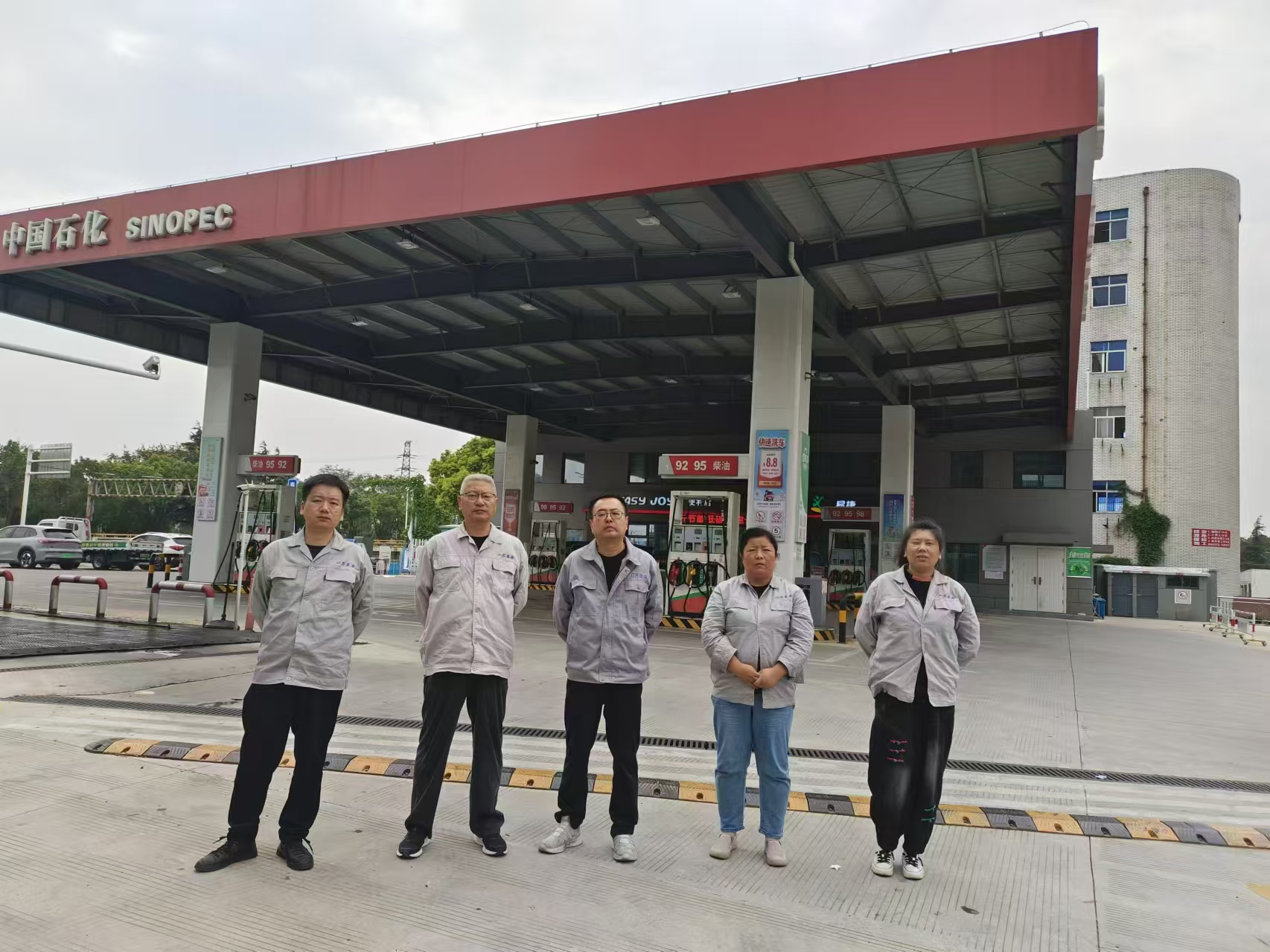 项目基本情况 | 中国石化销售股份有限公司江苏泰州泰兴长安加油站(以下简称中石化泰兴长安加油站)成立于2001年01月03日,企业性质为外商投资公司分公司,地址位于泰兴市大庆东路朱庄村,主要从事危险化学品汽油、柴油和一般经营项目润滑油等的零售业务以及汽车清洗服务。加油站现有从业人员9人,其中主要负责人为黄晓梅,站长为秦富荣,专职安全员为朱琴,均经泰州市应急管理局考核合格,取得了考核合格证。加油站占地面积3417m2(原土地使用证面积为4423.22㎡,由于城市道路扩大,加油站向南退让,于2021年12月改建,因此占地面积减少),埋地设置4只SF双层油罐,分别为单罐容积为30m³汽油储罐2只(92#汽油、95#汽油各1只)、单罐容积为20m³汽油储罐1只(98#汽油)、20m³0#柴油储罐1只,设置潜油泵式加油机4台共计24枪,油罐总容积为100m³,折合总容积为90m³(柴油折半计算)。根据《汽车加油加气加氢站技术标准》(GB50156-2021)表3.0.9条等级划分,该加油站为三级加油站。 | |||
